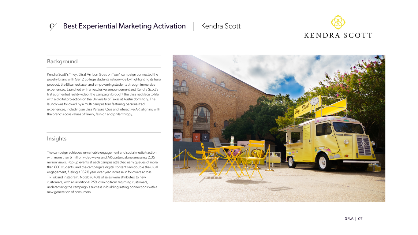 For Best Experiential Marketing Activation, Kendra Scott’s “Hey, Elisa! An Icon Goes on Tour” campaign secured the win by bringing its iconic Elisa necklace directly to Gen-Z students across college campuses. The jewelry brand combined experiential and digital engagement by launching the tour with its first augmented reality feature, showcasing the necklace suspended from the Scottish Rite dormitory at the University of Texas. Each campus activation featured experiences like interactive AR and exclusive pop-ups, drawing hundreds of eager students. With over six million video views and a 162% increase in social followers, the campaign resonated deeply, converting 40% of participants into new customers, reinforcing Kendra Scott’s leadership in experiential marketing.
