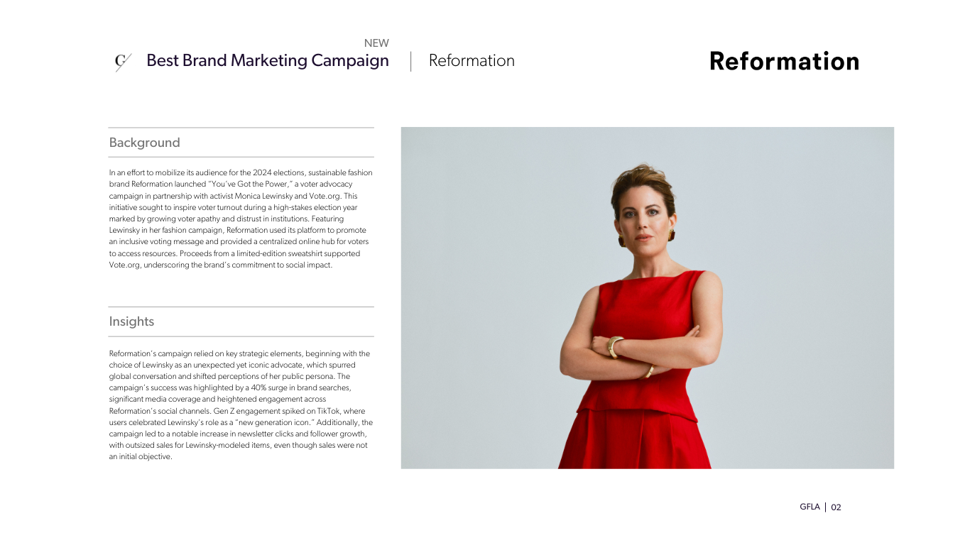 Reformation’s “You’ve Got the Power” campaign made waves by blending fashion with activism ahead of a pivotal election year, claiming the Best Brand Marketing Campaign award. Partnering with activist Monica Lewinsky, Reformation urged audiences, particularly Gen Z, to embrace their influence at the polls. With Vote.org, the pair provided an online hub for voting information, supporting it with the release of a campaign sweatshirt whose sales went entirely to the nonprofit. The campaign achieved a 40% spike in brand searches, two million impressions and viral engagement on TikTok, spotlighting Lewinsky as a cultural icon while underscoring Reformation’s commitment to style with purpose.