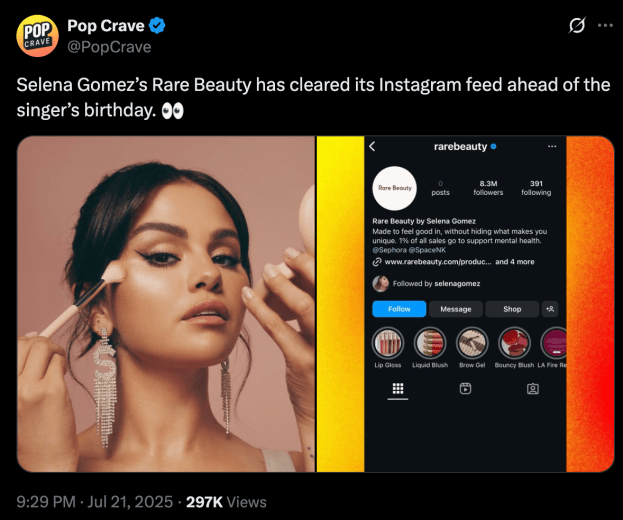 The Rare Beauty team, having never used the strategy before, didn’t know how long it would take for people to notice it had gone dark — but it happened within minutes, Murphy said. Given Gomez’s celebrity, even PopCrave, the popular gossip account, posted about it.