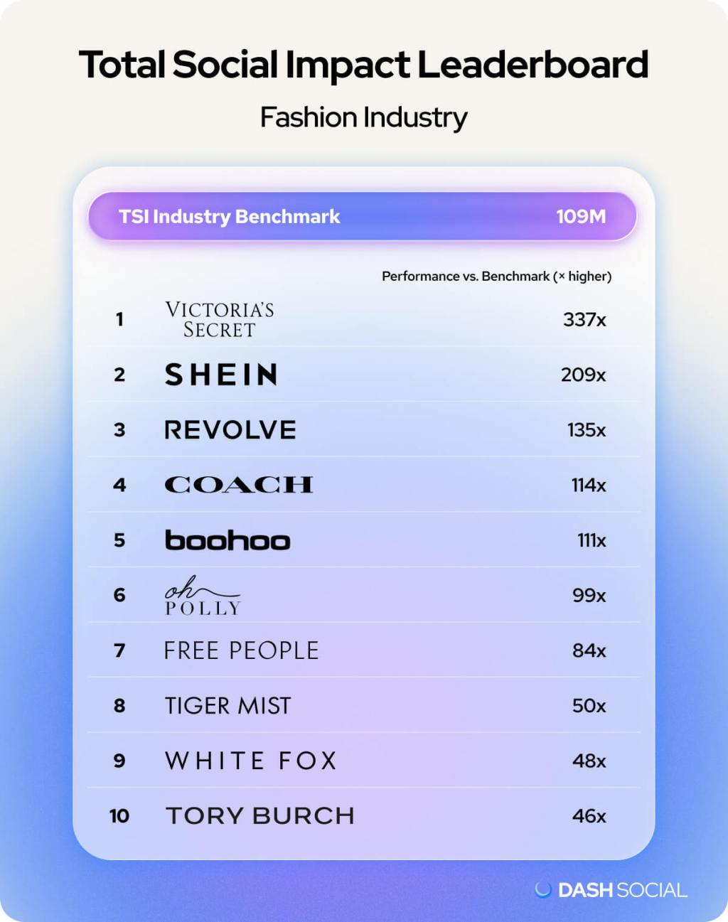 Dash Social also released leaderboards for fashion and retail brands. In fashion, Victoria’s Secret topped the rankings, with 337x the TSI of the category benchmark, followed by Shein, Revolve, Coach and Boohoo in the top five. In retail, Sephora dominated the category with 729x the benchmark, followed by The Home Depot, Amazon, Gap and Hollister.