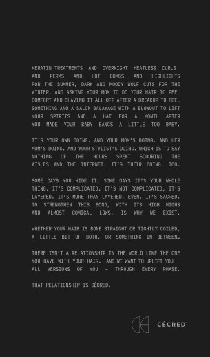 “It all comes down to hair being more than just beautiful ornamentation,” said Funmi Adejobi, copywriter at Wieden+Kennedy. “It’s emotional, personal, cultural, funny, tragic, triumphant — all of that and more. The story of our hair is the story of our lives. And no matter what kind of hair you have or what journey you’ve been on with it, there’s a story there. … Cécred understands the relationship with your hair — scientifically, culturally, emotionally — and makes products rooted in that deep understanding.”