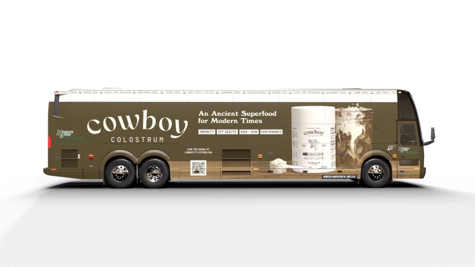 Outside of beverages, the brand has partnered with Post House, a boutique fitness studio in the Hamptons, on class takeovers and an in-studio drink bar. It will also be able to send its customers in for free classes throughout the summer. The studio also sells Cowboy Colostrum, which regularly sells out, its founders said. In addition, the brand will be orchestrating class takeovers at heated pilates studio Fuze House’s three locations, in New York City, Montauk and Miami. Finally, Cowboy Colostrum has wrapped a Hamptons Jitney, which will be running from June 23-July 30, in imagery from its Strawberry launch campaign.