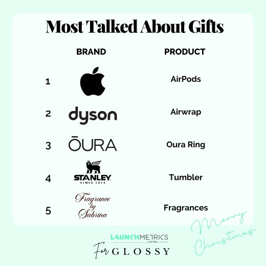 For Glossy, Launchmetrics compiled the top five most talked-about gifts for the 2024 holiday gifting season. The top three slots went to big-ticket technology and beauty tools. Apple AirPods, which start at $129, took the top spot, followed by Dyson Airwrap, the most expensive item in the top five at $599.99 at full price. The Oura Ring, the third-generation version of which retails for $299, came in at No. 3.
