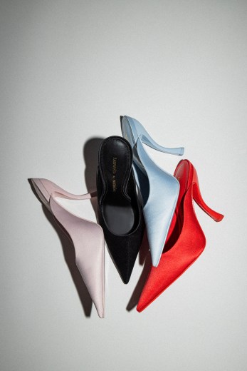 Footwear brand Larroudé’s latest collaboration is with Italian designer Nicolò Beretta. The capsule collection includes four pairs of shoes: satin ballet flats, pumps, and mules and boots with striking curved heels.