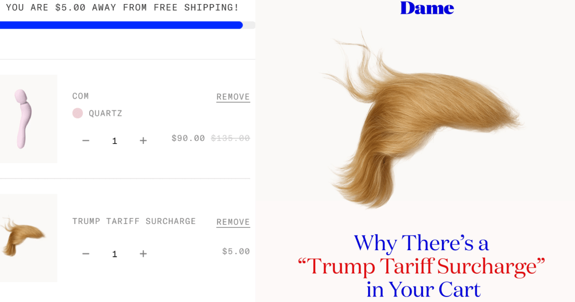 Some Dame products, including its signature vibrators, are made in China. Fine felt she had to do something to address the steep rise in costs to her supply chain. On April 9, the same day President Trump raised tariffs on Chinese goods to 145%, Dame added a $5 “Trump tariff surcharge” to customers’ shopping carts, including a graphic of Trump’s signature, fluffy blonde hair on the checkout page.
