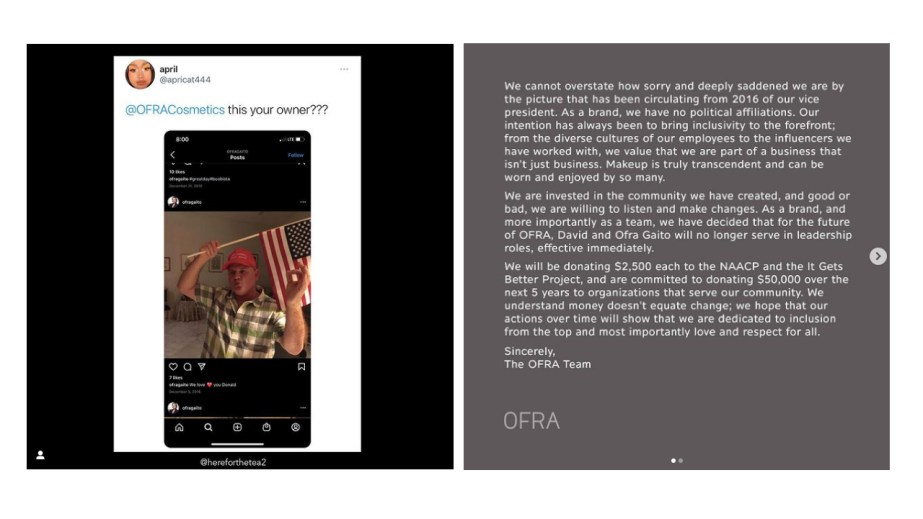 The photo was posted on Twitter by a user named April (@apricat444) on May 24, and was then picked up by influencer tea account Here for the Tea (132,000 followers), as well as beauty industry watchdog account Estée Laundry (186,000 followers), generating the recent online backlash. According to April’s tweet, the photo had been visible on the account until this time, though did not attract widespread attention. Major beauty influencers and Ofra collaborators including Gutierrez, Nikki de Jager (NikkiTutorials), Jen Luv, Samantha March, Stephanie Toms and Lauren Mae have made statements condemning the photo on their social channels.