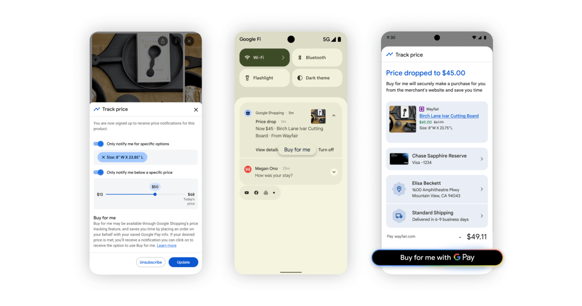 “You can tap the ‘track price’ button to set up a personalized price drop alert,” Rincon said, explaining the customer experience. “When the price drops in your desired range from any merchant across the web, we’re going to send you an alert, and if that merchant is eligible, you can also give Google permission to buy it for you.”