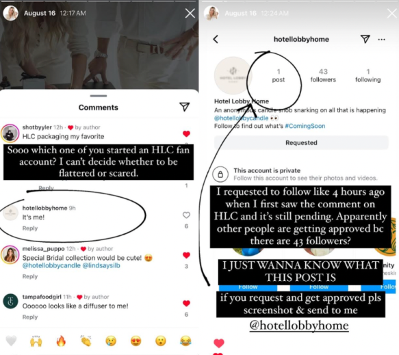 The @hotellobbyhome account has since amassed 712 followers, though it is private. The bio now reads “A not-so-anonymous candle snob snarking on all that is happening @hotellobbycandle 👀”