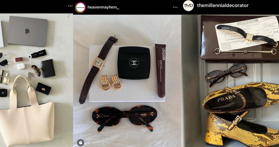 Rabinowitsch said it’s the storytelling that has differentiated her content, as well as the timing (she was one of the first to revisit the concept) and her unique aesthetic. “We’ve seen a million bag flat lays with products sitting all around the bag. But for me, I had the idea to shoot the products on top of the bag. … that’s pretty distinctive,” she said.