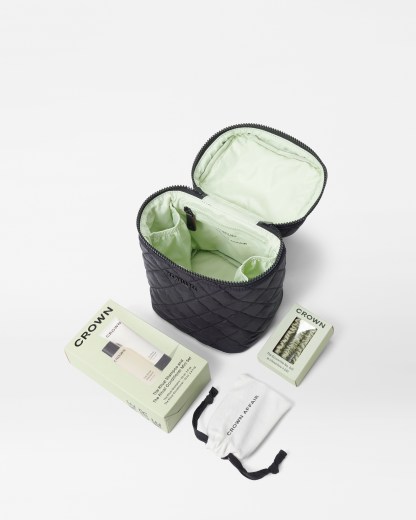 Packing just got a bit easier, at least when it comes to your hair needs, thanks to this co-branded set designed by the classic bag brand MZ Wallace and the cool-girl hair brand Crown Affair. The kit features MZ Wallace’s Large Vanity case in black, with an interior in Crown Affair’s signature mint green. Inside are three of Crown Affair’s silk hair ties, its flat lay-worthy comb, and minis of its shampoo and conditioner.