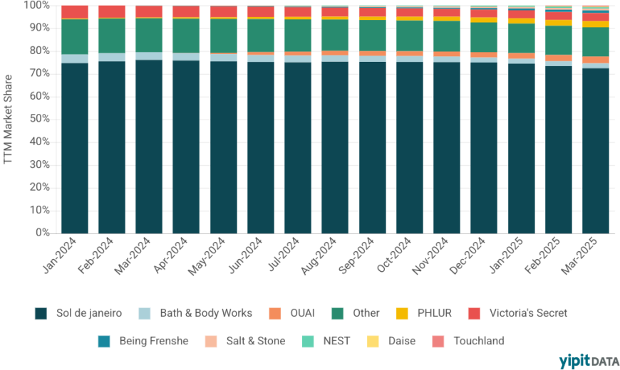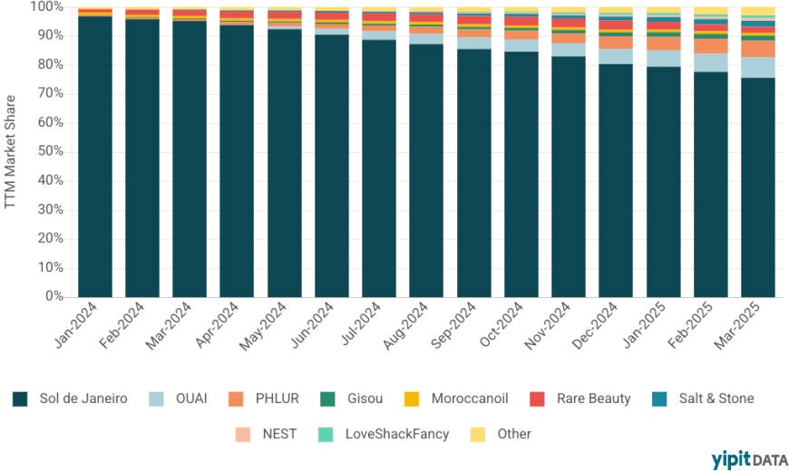 While Sol de Janeiro remains very popular — as confirmed by a 12-year-old Glossy spoke to — it is losing market share as options expand. According to the YipitData Insights Team’s data, “We’ve seen Ouai and Phlur pick up share in the hair and body mist category, with Sol de Janeiro seeing share fall from 95% of the category to [about] 77%.” FWIW: Ouai is another favorite of the 12-year-old.